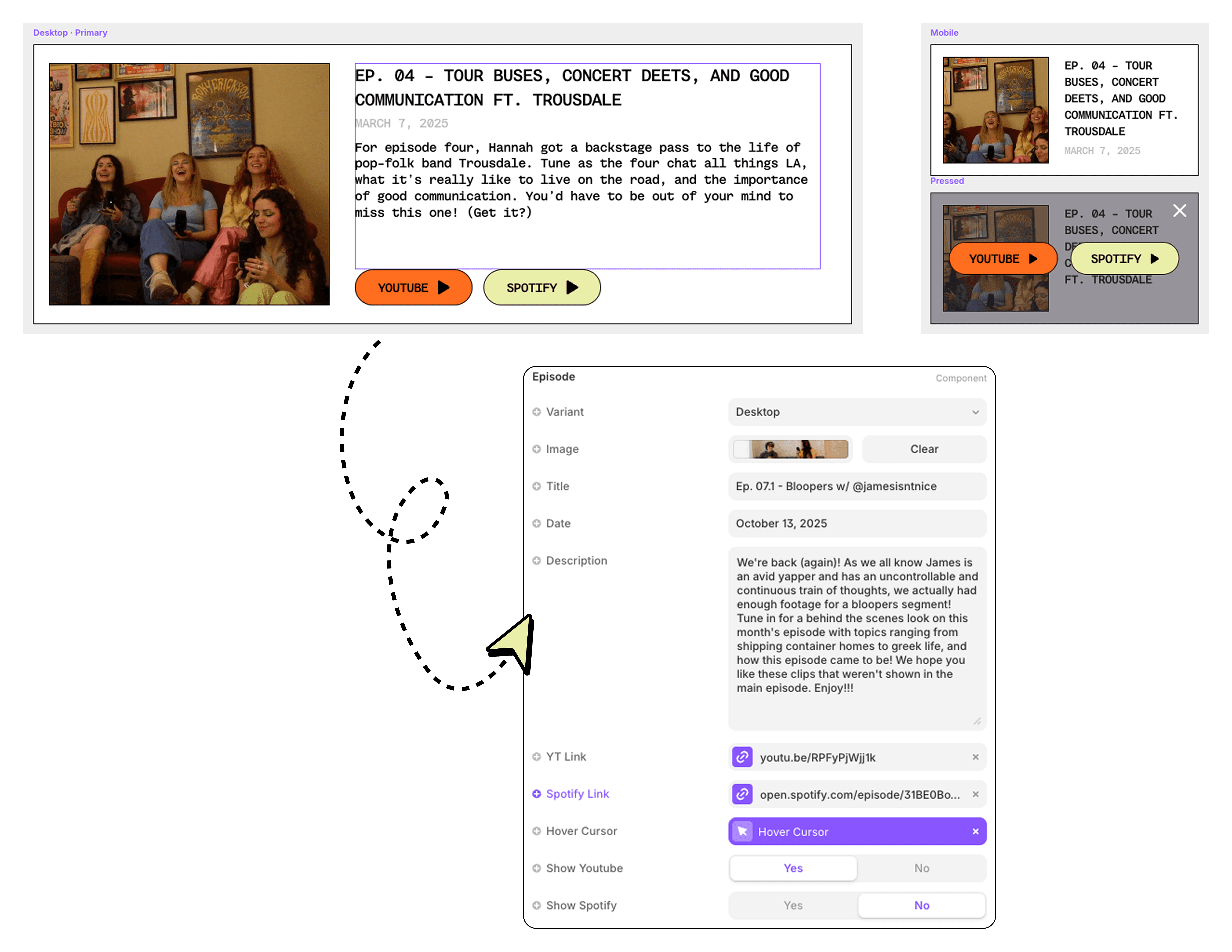To optimize the podcast episode upload process, while also not requiring another CMS collection which would have costed extra money, I created a component that would have simple input fields that even non-technical teammates would be able to manage.
